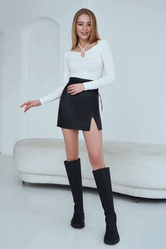 Лонгслів облягаючого крою з довгим рукавом і з зав'язкою на шиї. Родзинкою моделі є виріз у вигляді краплі. Лонгслів вдало доповнить яскраве вбрання в повсякденний образ.
