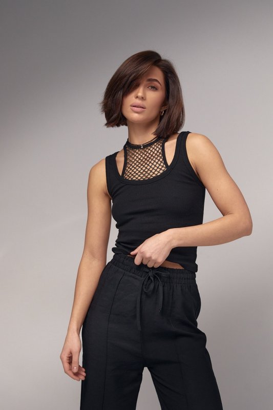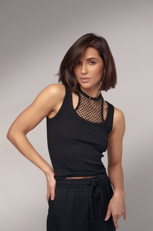 Модель виконаний з трикотажу в дрібний рубчик з окантовкою на проймах та широкій горловині. Верху майка доповнена декоративною вставкою із блискучої сітки. Таке дизайнерське рішення перетворює звичайну майку на модну та трендову річ.