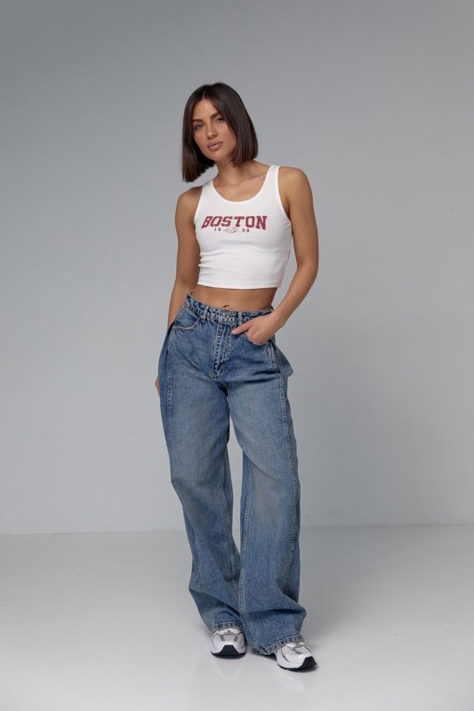 Принт у вигляді напису Boston, який спереду прикрашає виріб, стане родзинкою твого вбрання. У моделі краї низу прямі, кругла горловина та пройми обшиті тонкою окантовкою.