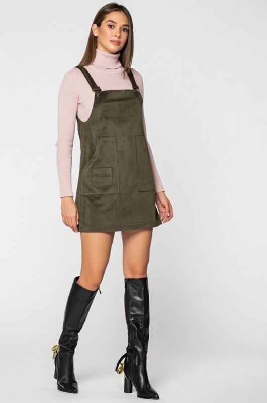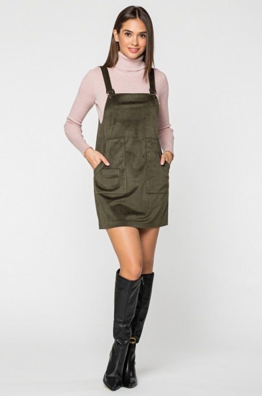 Модний сарафан з вельвету прямого крою на широких регульованих бретелях.