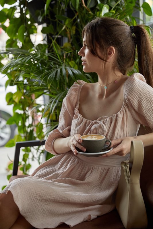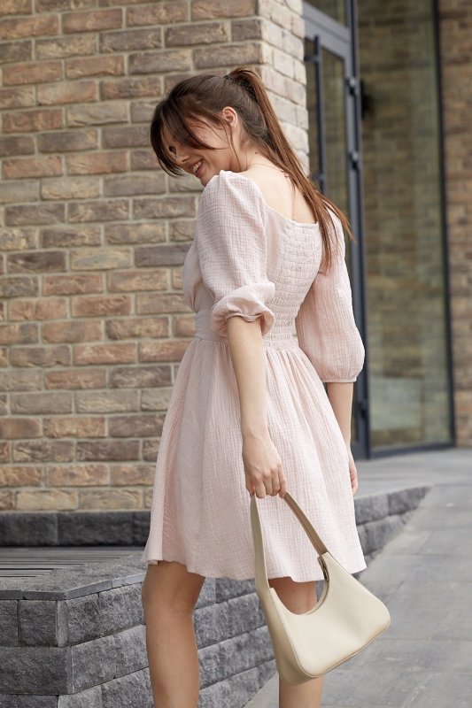 Муслінова сукня міні. Передня частина сукні зібрана куліскою, що створює чарівний ефект. Збірка під лінією грудей додає особливого шарму цій сукні. На талії ви бачите пришивний пояс. Спідниця сукні має класичний кльош-крій і зібрана по талії. Центральна частина спинки з резинкою, що забезпечує комфортну посадку. Унікальна особливість цієї сукні в рукавах, які можуть використовуватися як бретелі. Низ рукава зібран резинкою.