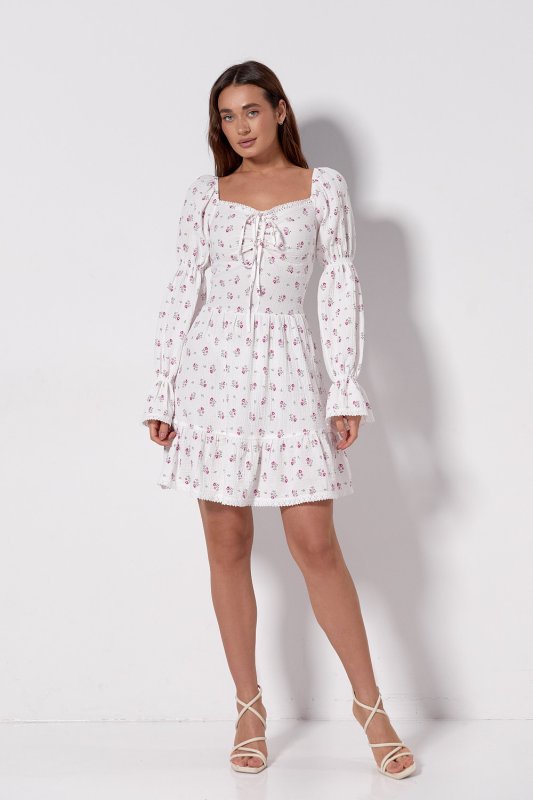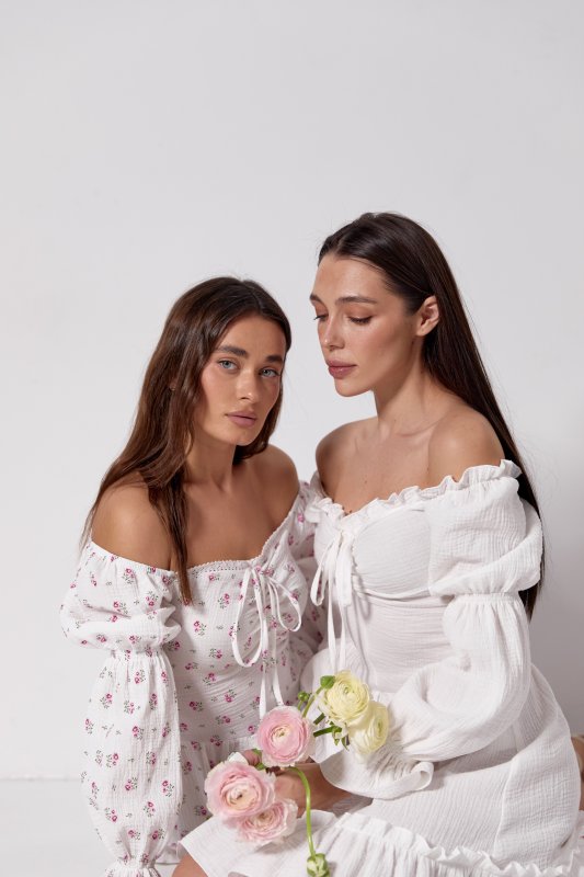 Муслінова сукня міні, принт квіти. Виріз горловини з рюшою. Спереді зі зборкою на грудях. Спідниця - кльош, зібрана на талії, по низу спідниці рюша. Рукава довгі. По верху і по низу рукава резинка. Спинка зібрана резинкою, яка гарантує прилегання.