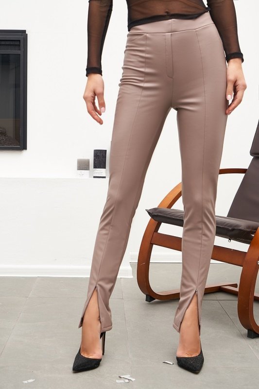 Облягаючі легінси з еко-шкіри з високою посадкою. Родзинкою легінсів є розрізи внизу вироби, які застібаються на потаємну блискавку. А так же шви, які йдуть по центру штанини. Легінси без застібок, на гумці.