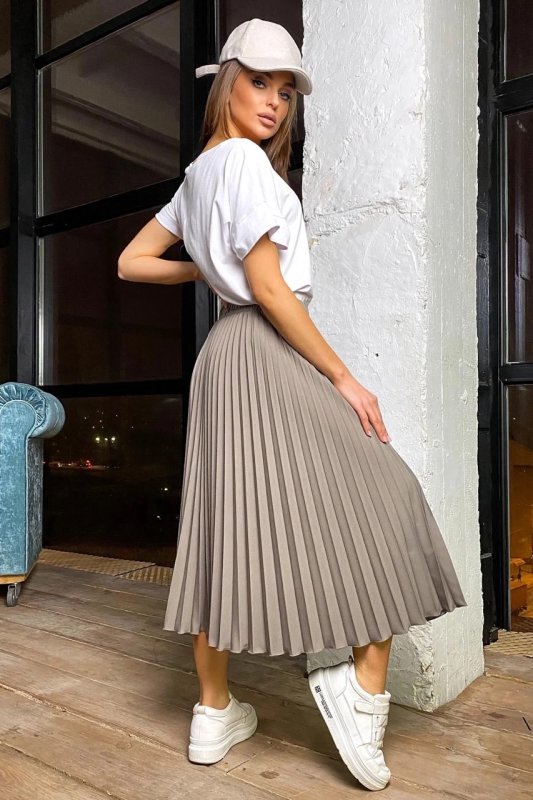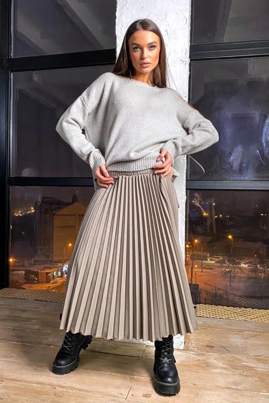 Однотонна спідниця пліссе в сірому кольорі. Ніжний матеріал приємний до тіла. Спідниця має прямий, розкльошений фасон. Ідеально поєднується з джемпером, футболкою, косухою та джинсуванням.