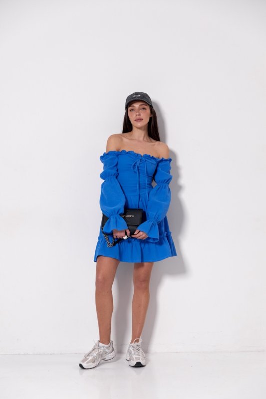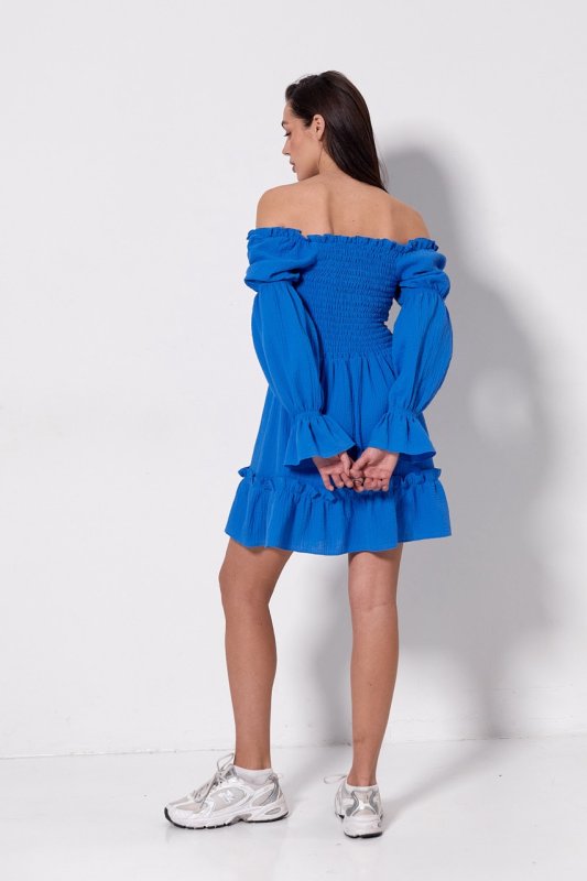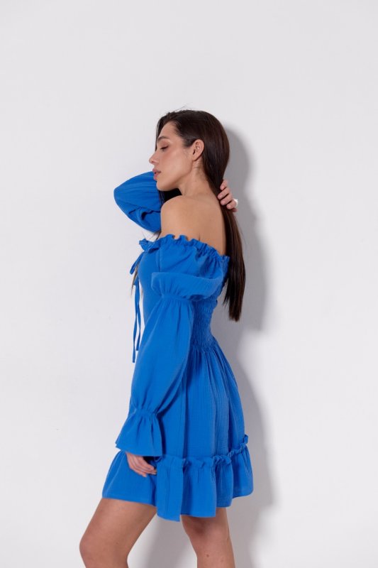 Однотонна муслінова сукня міні. Виріз горловини з рюшою. Спереді зі зборкою на грудях. Спідниця - кльош, зібрана на талії, по низу спідниці рюша. Рукава довгі. По верху і по низу рукава резинка. Спинка зібрана резинкою, яка гарантує прилегання.