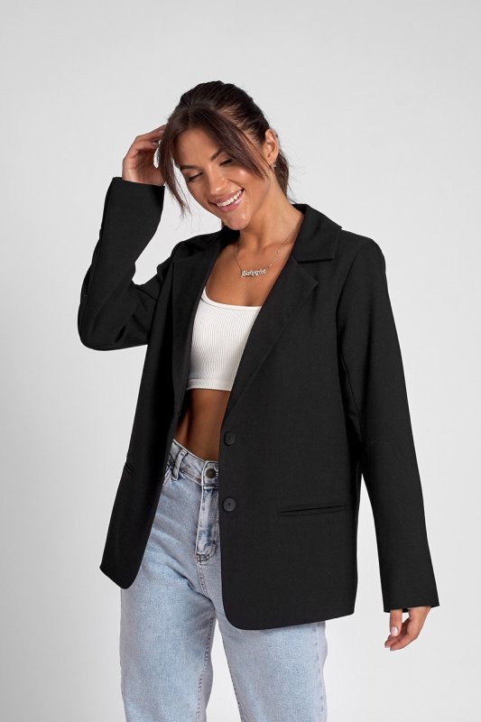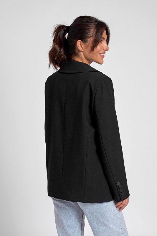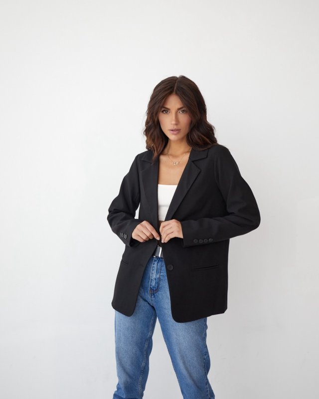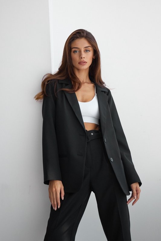 Піджак на підкладці, довжина нижче лінії стегон. Рукава вшивні, довгі, двушовні з гудзиками на імітованій шліці. Кишені прорізні із обшивками. Комір піджачного типу, що застібається на гудзики, низ краю борту заокруглений.