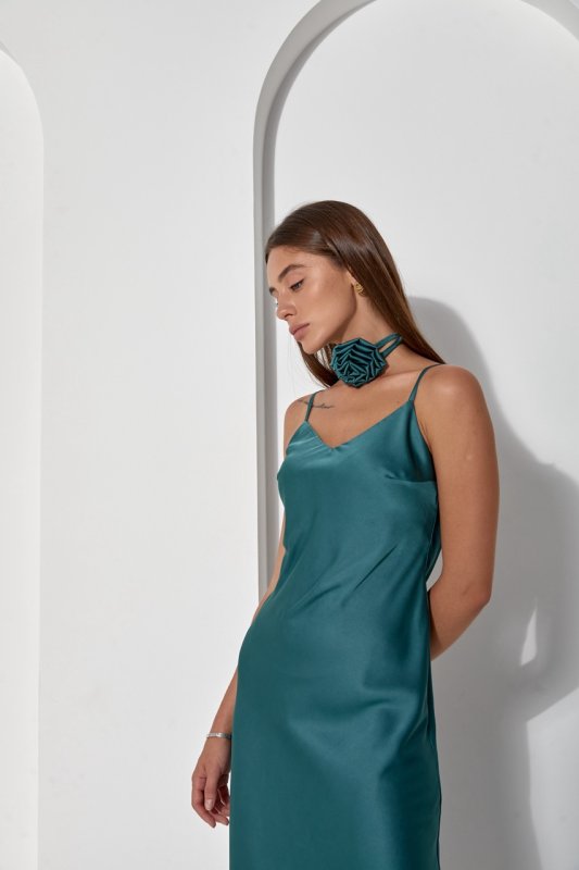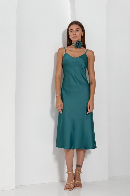 Сукня комбінація в білізняному стилі, міді, чорного кольору, на тонких брителях, які регулюються. Виріб викроений по косині тканини, що створює ідеальне прилегання по фігурі. До низу плаття розширене.
