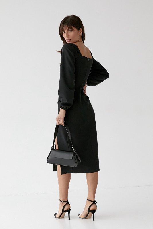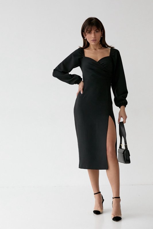 Сукня міді з розрізом. Пілочка відрізна, лінія талія завишена. Ліф на запах зі складками. Виріб виконано з талієвими виточками. Переднє полотнище спідниці з високим розрізом на лівій нозі. В середньому шві спинки застібка на приховану тасьму блискавку. Рукава довгі, внизу зібрані на резинку. Верхня частина рукава зібрана на резинку, яка використовується, як бритель.