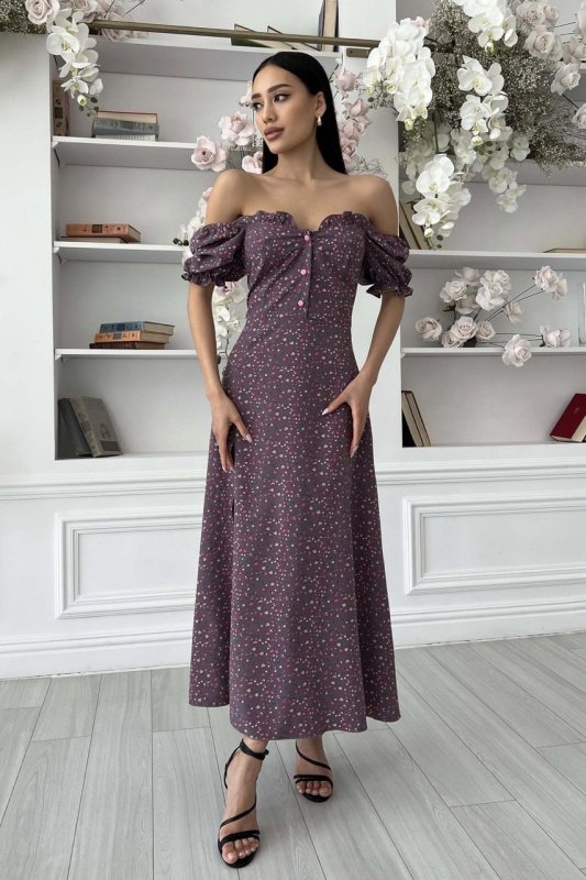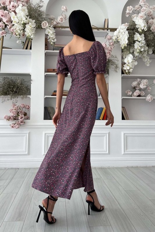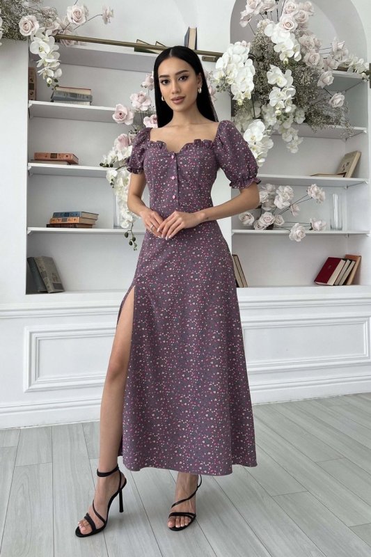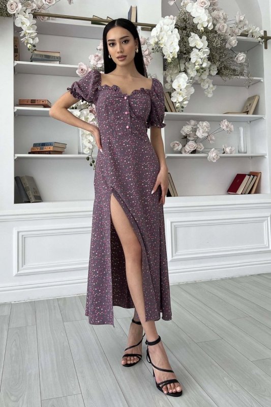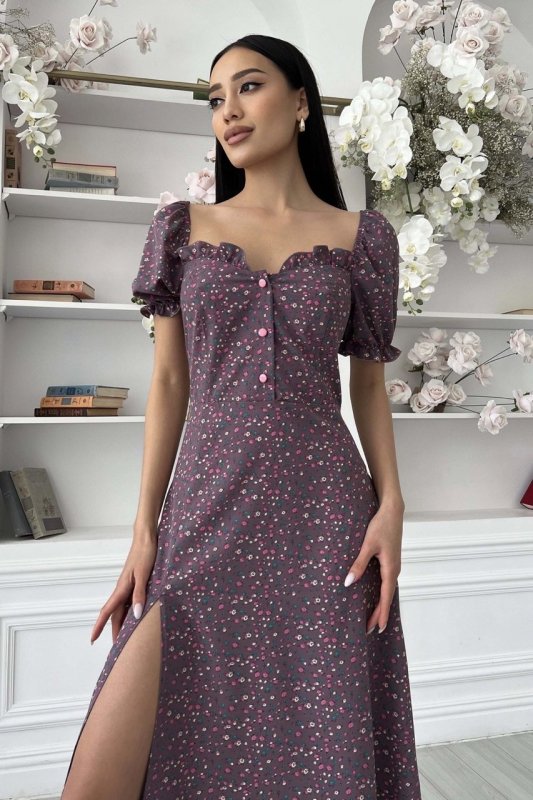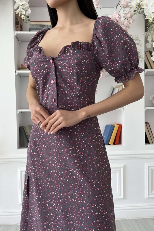 Літня сукня-міді романтичного крою. Виконано з принтованої тканини, що струмує, в дрібний квітковий принт. Модель прикрашає фігурний виріз та оборка по ліфу, що підкреслює зону декольте. Короткий рукав-ліхтарик із еластичною манжетою. Довга спідниця а-силуету підкреслює лінію талії. Збоку передбачено невеликий розріз.