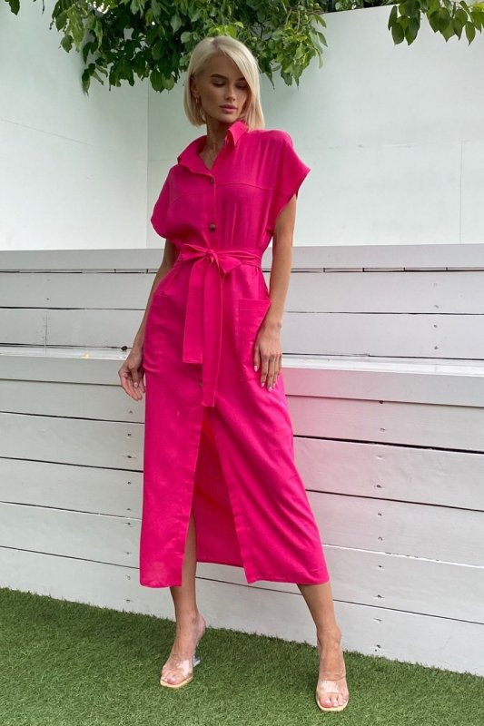Подовжене плаття-сорочка з льняної тканини: класичний відкладний комір, короткий спущений рукав з фіксованими вилогами, з’ємний пояс і дві накладні кишені. Надзвичайно легка та універсальна модель на кожен день!