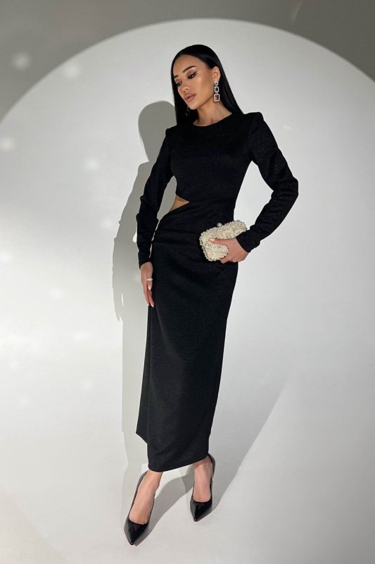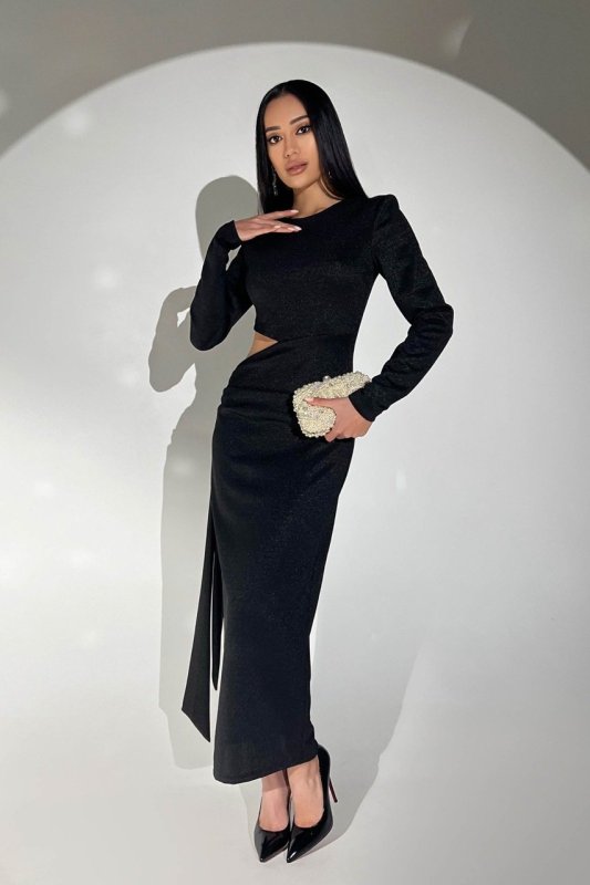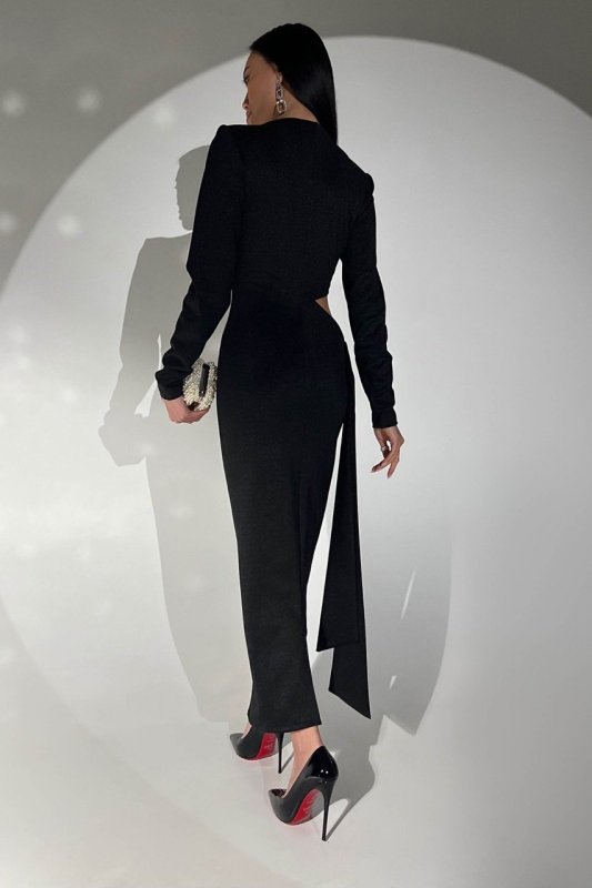 Вечірня сукня для особливих випадків. Виконали з еластичного трикотажу з люрексною ниткою, який сідає точно по фігурі. Високий фігурний виріз збоку візуально витягує лінію стегна, а довгий пояс надає оригінальності образу. Застібається на таємну блискавку в центральному шві спинки.
