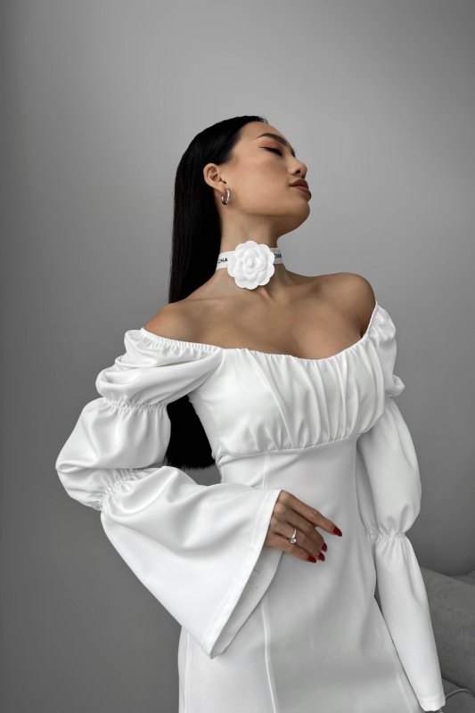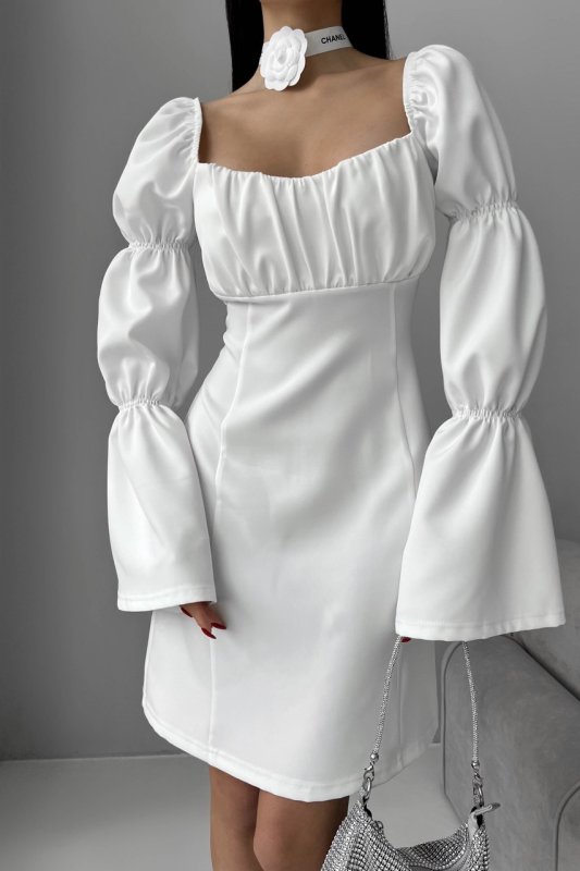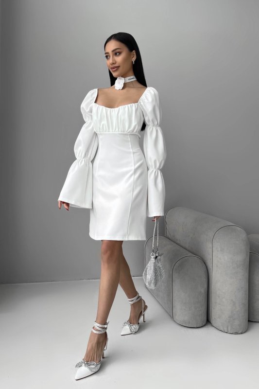 Завітайте у світ грайливості та яскравості з нашою міні – сукнею. Одночасно елегантний та сексуальний наряд підкреслить Вашу індивідуальність. Модель відріняють цікаво оформлені рукава з драпіровками, розкльшені до низу. Драпіроний ліф на поролоні, по спинці блискавка.