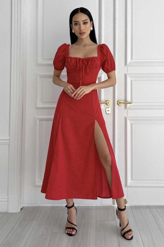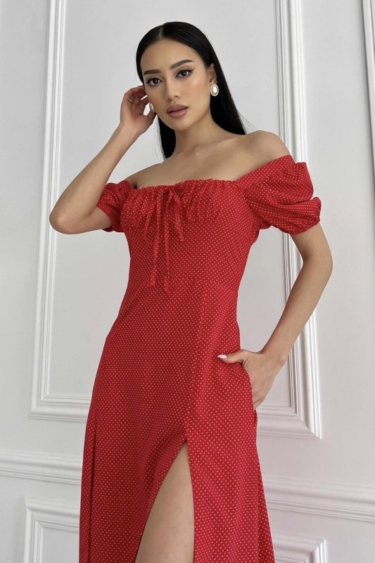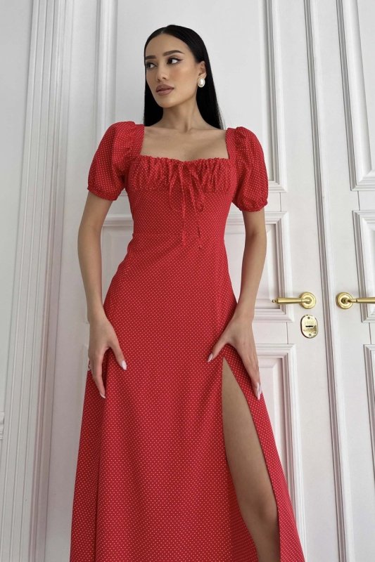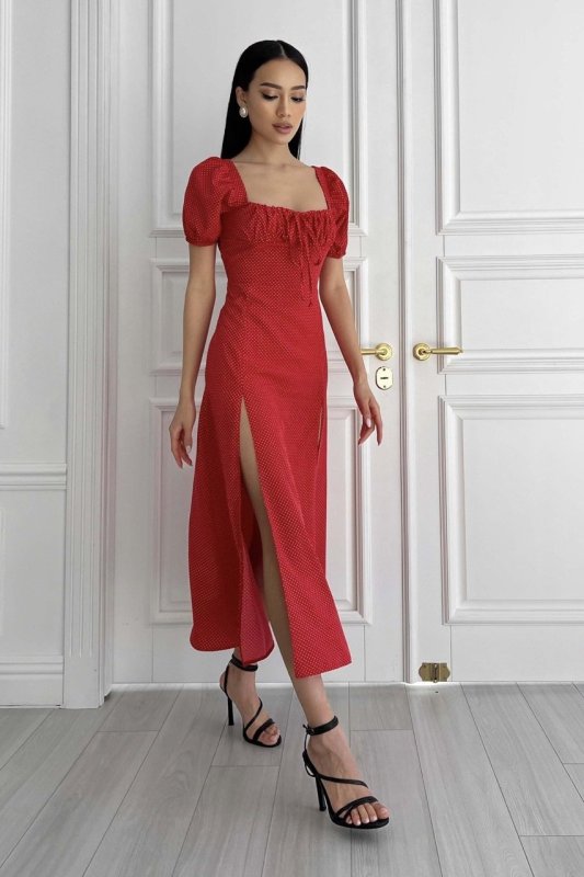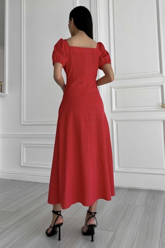 Літня сукня-міді романтичного крою. Виконано з принтованої тканини (горошок), що струмує. Модель прикрашає фігурний виріз та драпіровка по ліфу, що підкреслює зону декольте. Короткий рукав-ліхтарик із еластичною манжетою. Довга спідниця а-силуету підкреслює лінію талії. На спідниці передбачено два розрізи.