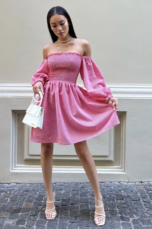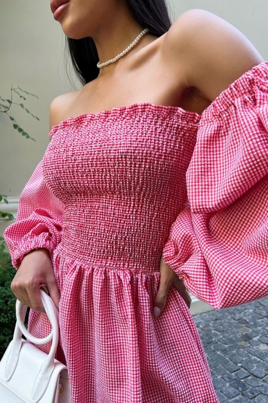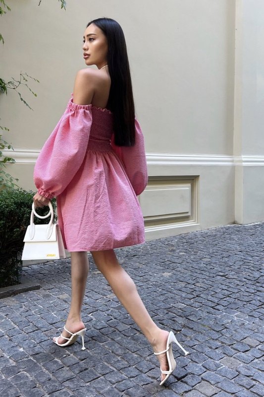 Міні-сукня із завищеною талією, еластичним ліфом і відкритою лінією плечей, буде особливо актуально в жаркі дні. Легка однотонна модель з рукавами-ліхтариками, зшита з дихаючого тонкого матеріалу виконано в яскравій палітрі літніх кольорів.