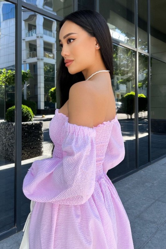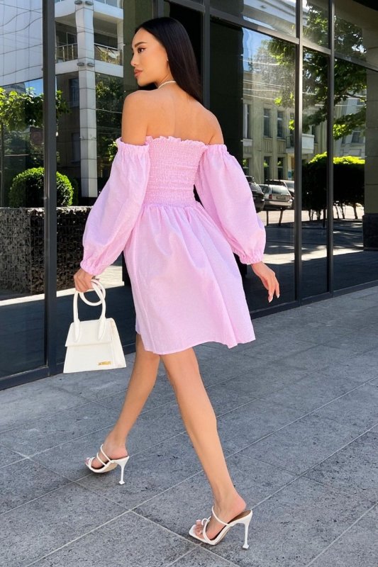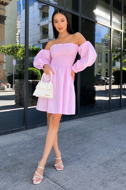 Міні-сукня із завищеною талією, еластичним ліфом і відкритою лінією плечей, буде особливо актуально в жаркі дні. Легка однотонна модель з рукавами-ліхтариками, зшита з дихаючого тонкого матеріалу виконано в яскравій палітрі літніх кольорів.