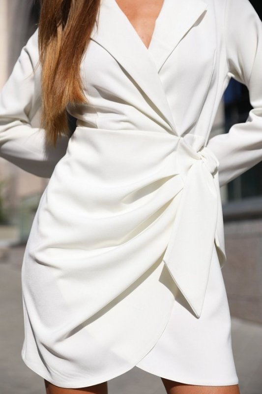 Сукня класичного фасону з костюмної тканини. Верх виробу піджачного типу з англійським коміром і довгим рукавом. Драпірована подвійна спідниця в запах, яка зав'язується на красивий вузол. Ззаду плаття застібається на потаємну блискавку.