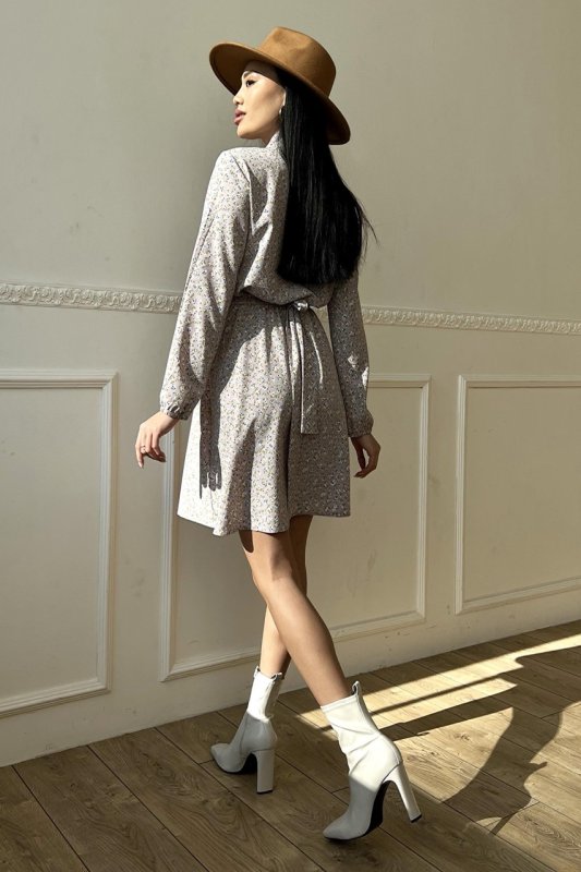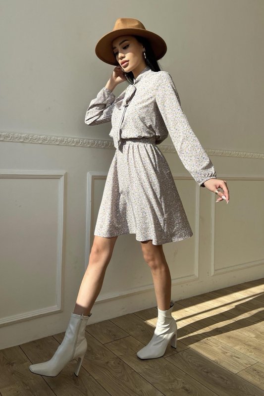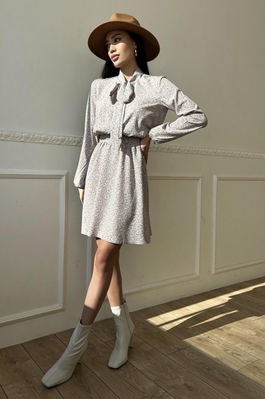 Вільний довгий рукав з еластичною манжетою, пояс у колір сукні, комір-аскоту із зав'язками, коротка спідниця - допоможуть створити неповторний образ на кожен день.