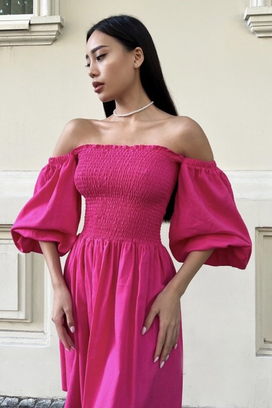 Оригінальна літня міні- сукня з льону. Відкриті плечі та ефектний довгий рукав-ліхтарик. Шикарну розкльошену юбку, доповнює еластичний ліф. Міні-сукня із завищеною талією, еластичним ліфом і відкритою лінією плечей, буде особливо актуально в жаркі дні.
