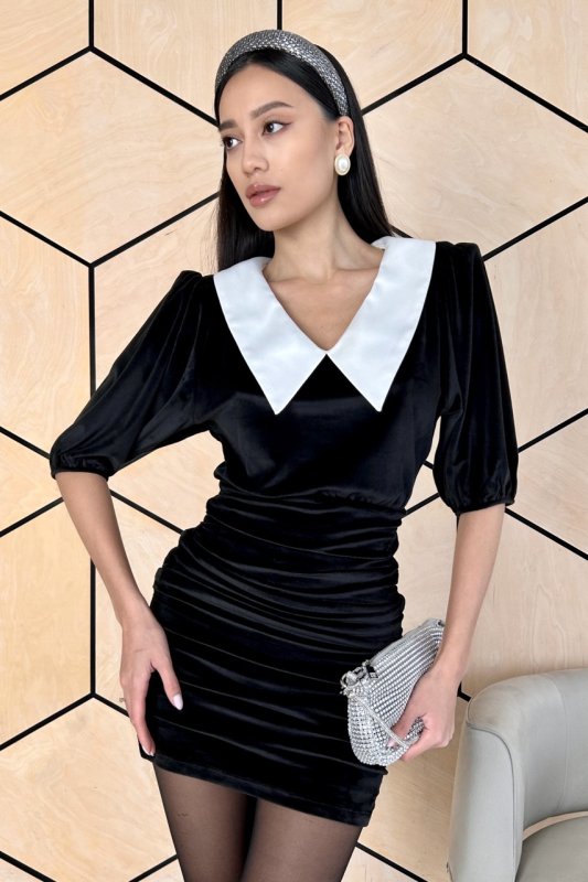 Ця елегантна сукня з велюру та красивим білим комірцем. Вона стильна та має вишуканий дизайн, який привертає увагу.