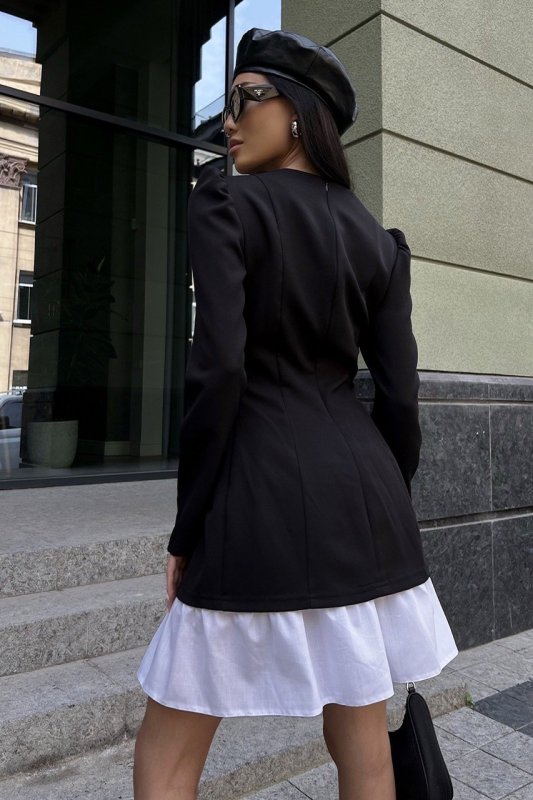 Смілива та сексуальна сукня-двійка стане справжнім втіленням грайливості та кокетства. Сукня прилеглого силуету з фігурним квадратним вирізом дозволить продемонструвати красиву лінію декольте. Довжина міні, зона декольте формується завдяки формованій чашці та шнуровці попереду. До сукні передбачена окрема спідниця - під'юбник. Плаття представлено у цікавій комбінації чорного з білим - стане чудовою прикрасою свята чи сукнею на кожен день.
