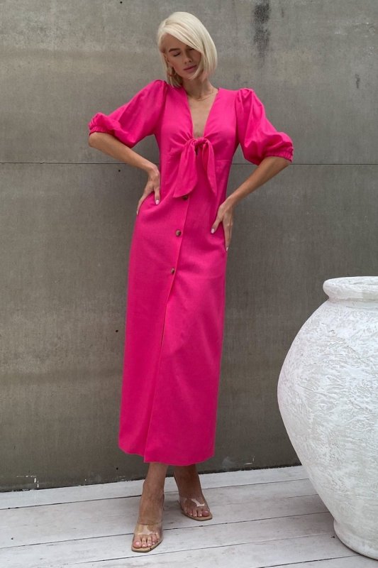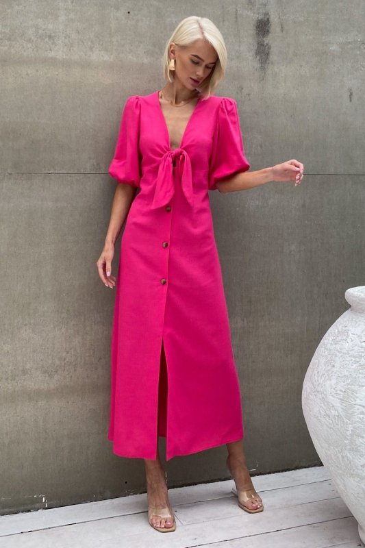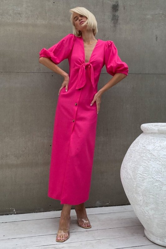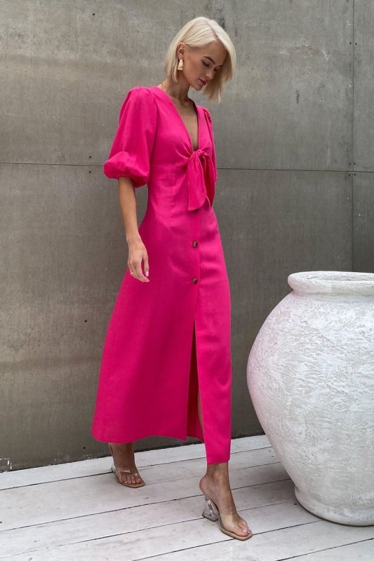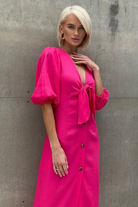 Надзвичайно ніжна та жіночна сукня з льону подовженого силуету. По переду планка з ґудзиками, ліф оформлюється красивими зав’язками. Фігурний V-подібний виріз і короткі рукава на резинці підкреслять ключиці і акцентують увагу на декольте. Напів-прилеглий крій новою сукні прийдеться до смаку найвибагливішій модниці. Ідеальне рішення на будь-який тип фігури.