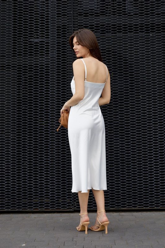 Сукня комбінація в білізняному стилі, міді, чорного кольору, на тонких брителях, які регулюються. Виріб викроений по косині тканини, що створює ідеальне прилегання по фігурі. До низу плаття розширене.