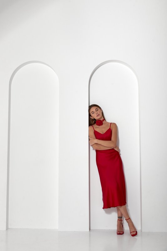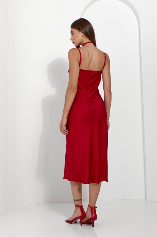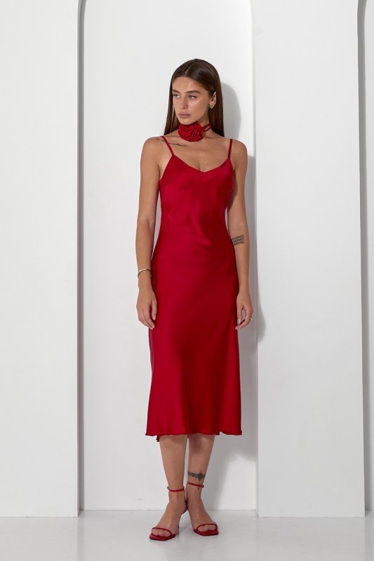 Сукня комбінація в білізняному стилі, міді, чорного кольору, на тонких брителях, які регулюються. Виріб викроений по косині тканини, що створює ідеальне прилегання по фігурі. До низу плаття розширене.