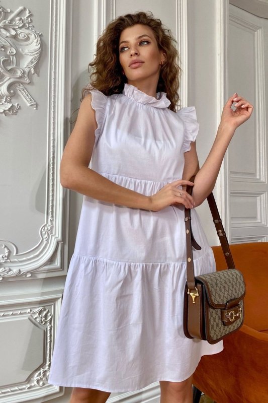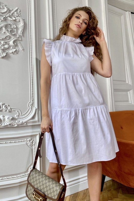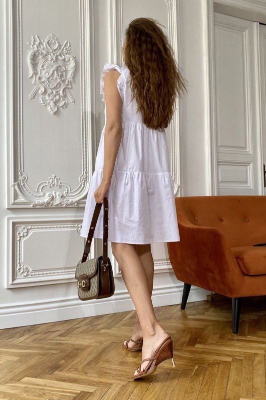 Жіночна сукня вільного крою з рукавами-крильцями, та ціково оформленою горловиною- справжня знахідка! Літня сукня з короткою спідницею, виготовлена з натуральної тканини. Завищена лінія талії, багатоярусна спідниця та рукав з воланом, який надає сукні кокетливого настрою. Модель чудово підійде для міської прогулянки та для побачення)
