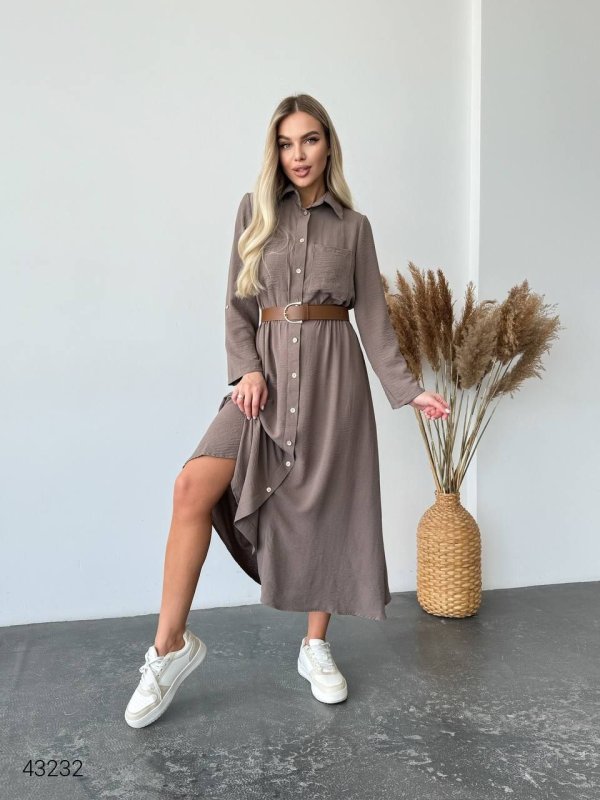 Сукня міді з гудзиками. Пояс у комплекті. Сукня з довгим рукавом, який можно регулювати. Застібається на ґудзики. Талія на резинці, за рахунок чого ідеально сідає по фігурі. Накладні кишені. Можно носити під різне взуття та вдягати на будь який випадок.