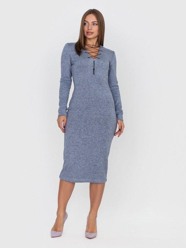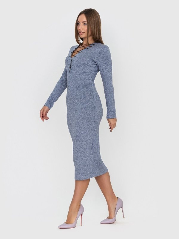 Затишне і тепле плаття Мірабель володіє лаконічним дизайном і актуальною в цьому сезоні довжиною міді. Сукня прилеглого силуету ідеально сідає по фігурі, підкреслюючи її жіночні вигини. Ефектне виконання має область декольте, доповнена металевою шнурівкою.