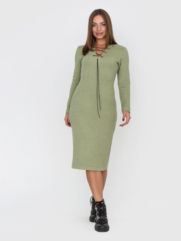 Затишне і тепле плаття Мірабель володіє лаконічним дизайном і актуальною в цьому сезоні довжиною міді. Сукня прилеглого силуету ідеально сідає по фігурі, підкреслюючи її жіночні вигини. Ефектне виконання має область декольте, доповнена металевою шнурівкою.