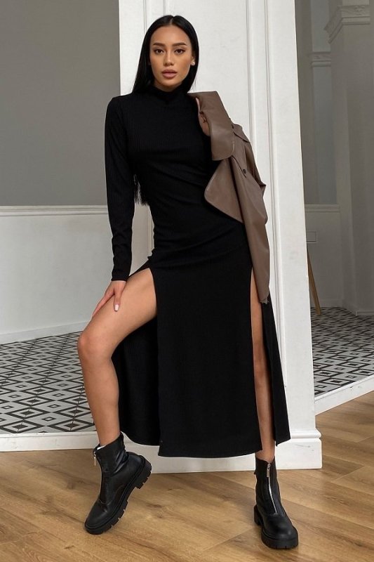 Приталене плаття облягаючого крою з високими розрізами з боків. Універсальний варіант для будь-якого типу фігури, розрізи з боків ефектно витягають фігуру. Модель виходить в актуальних осінніх колірних рішеннях. Таке плаття відмінно підійти для щоденного використання а також для романтичної вечері.