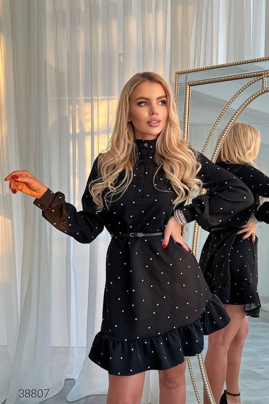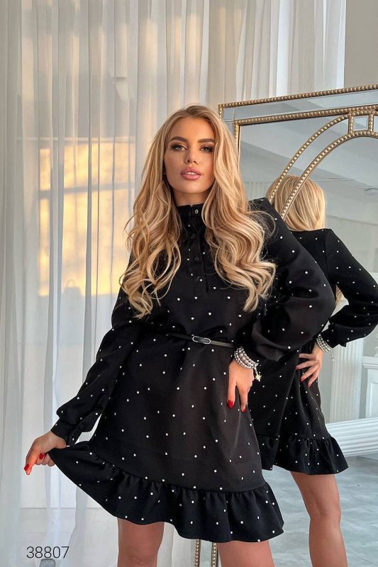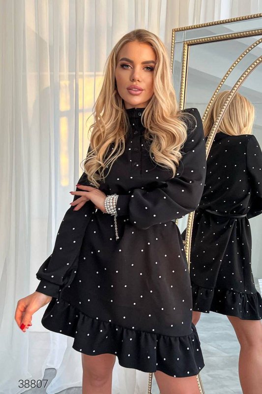 Сукня вільного А-силуету з якісного костюмного крепу. Комір-стійка, об'ємні рукава з манжетами на ґудзику, планка на ґудзиках. Нижня кромка з оздобленням оборкою.