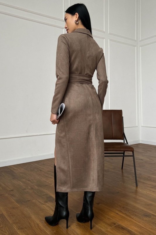 Стильна сукня-міді виконана з м'якого матеріалу еко-замші. Модель стилізована складами на талії, що допомагають зробити додатковий акцент на жіночних вигинах фігури. Ліф на запАх, пояс вшитий. Рукав ¾, по нозі високий розріз, по спинці передбачена блискавка для вашого комфорту.