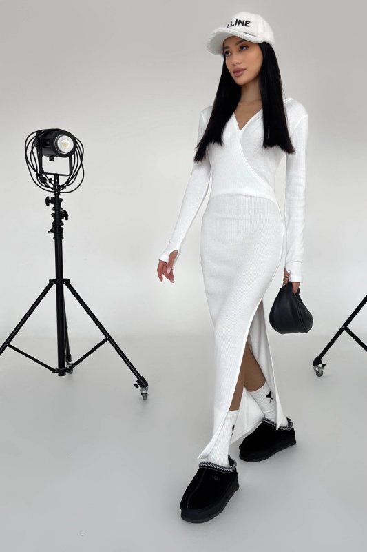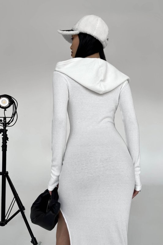 Стильна сукня з капюшоном міді довжини. Сукня з довгим рукавом з вирізом під пальчик та високим розрізом по нозі.