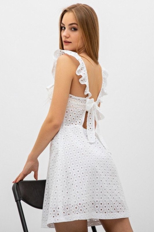 Романтичне плаття з прошвы з відкритою спинкою і оборками на бретелях і горловині. Зав'язується на бант ззаду.