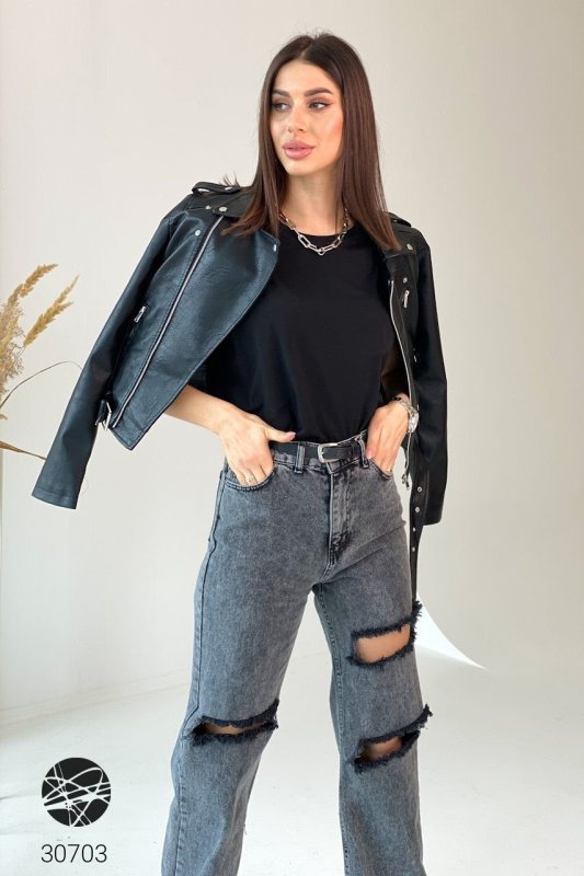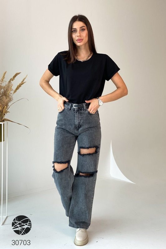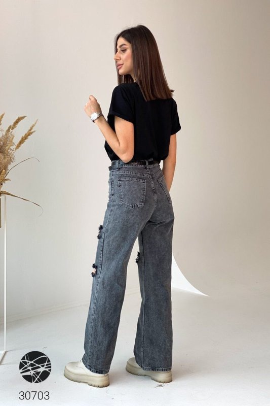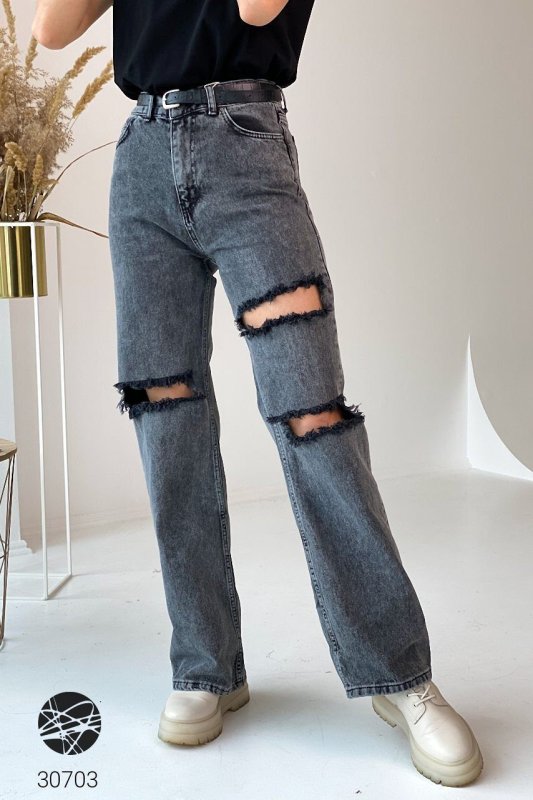 Джинси в вінтажному стилі з щільного якісного котону, виробництва Туреччини. Завищена талія, шлевки, бічні прорізні кишені і накладні кишені ззаду. Прихована ширінка із застібкою на блискавку і гудзик, розрізи з необробленими краями. Склад тканини: 98% - котон, 2% - еластан.