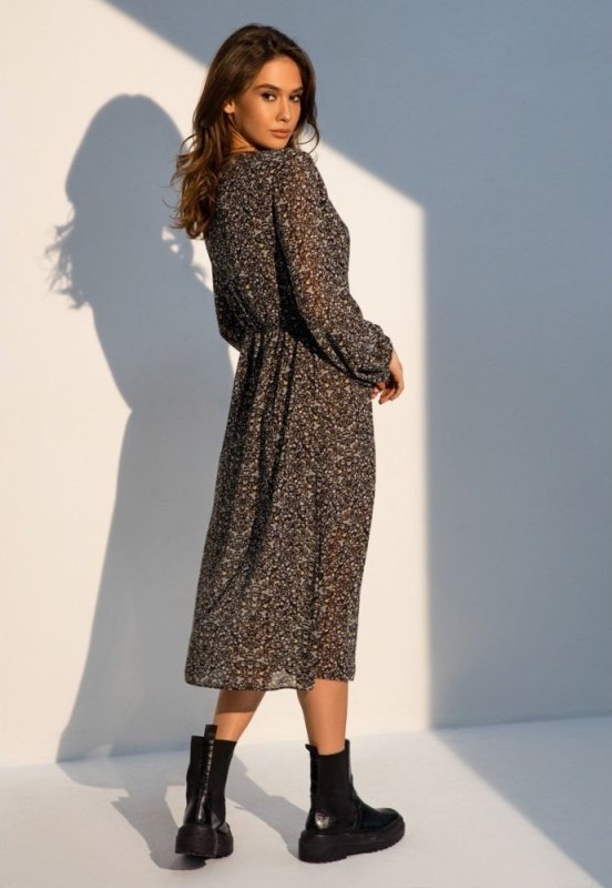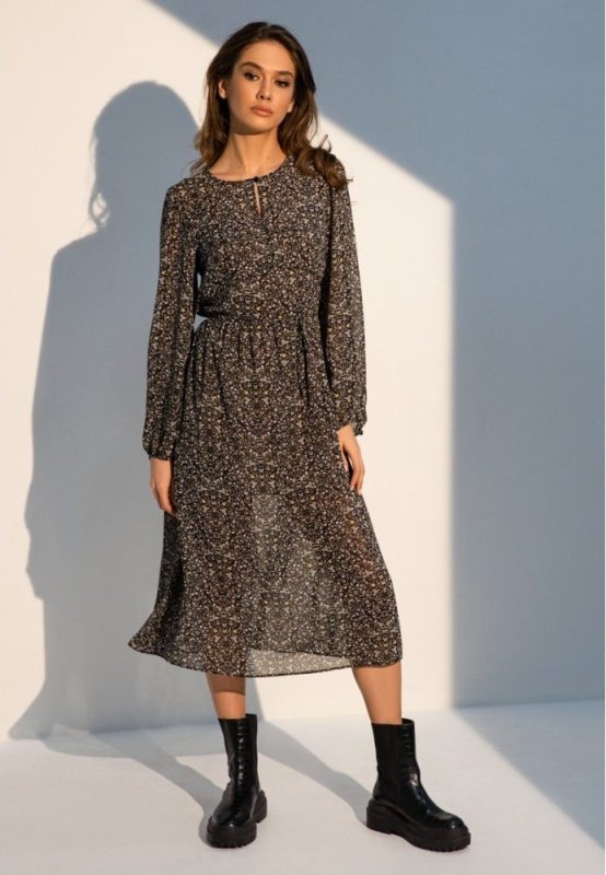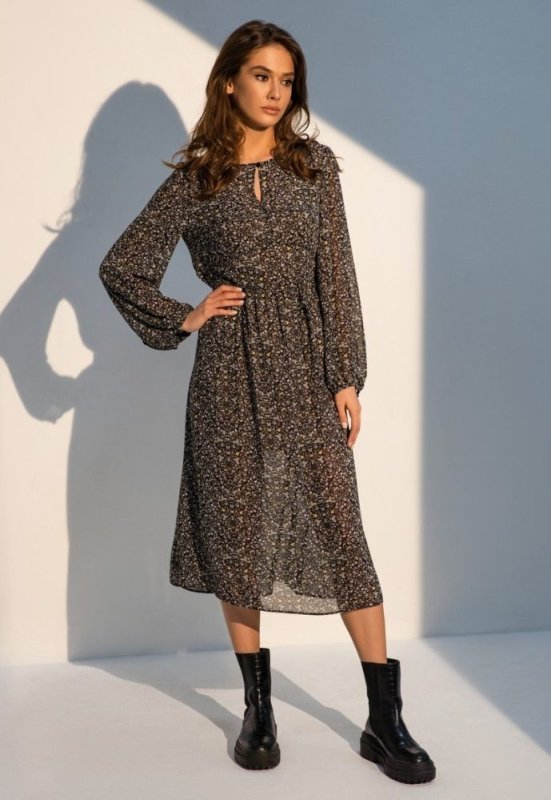 Повітряне шифонове плаття довжини міді на трикотажній підкладці. Відрізна талія з поясом-зав'язками з основного матеріалу. Округлий виріз горловини прикрашений вирізом крапля на грудях, застібається на гудзик, об'ємний довгий рукав на еластичній манжеті. Сукня з шифону-втілення жіночності і легкості в одязі. Кожна жінка в такому вбранні, незалежно від віку і будови фігури, перетвориться в тендітну, ніжну і граціозну панночку.