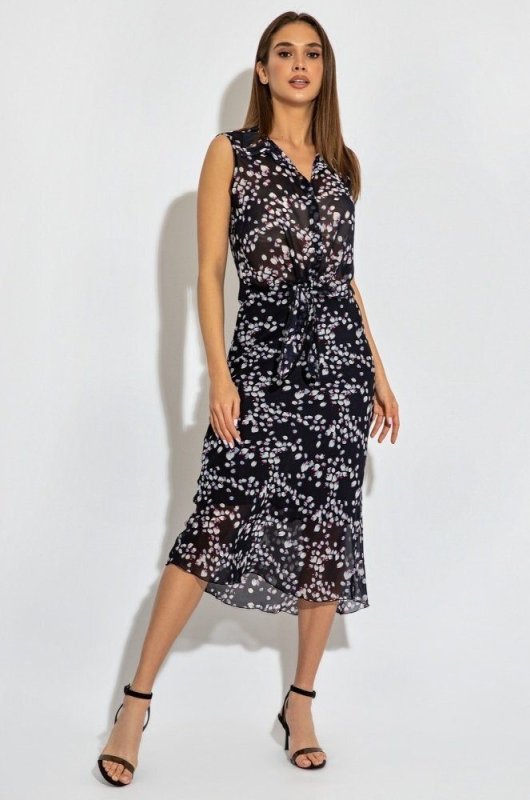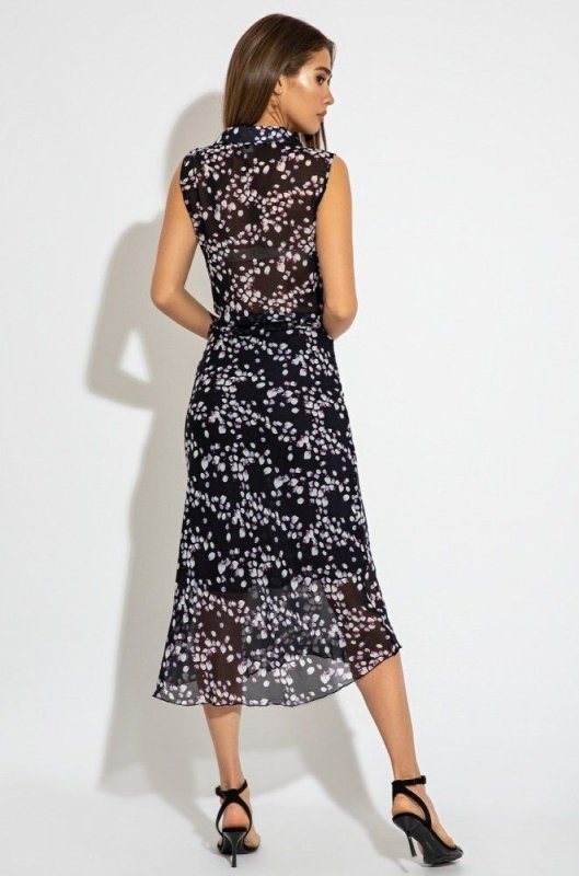 Сорочка-американка в витончений принт з ніжного шифону, з коміром стійкою з зав'язками на талії. Застібається на гудзики.