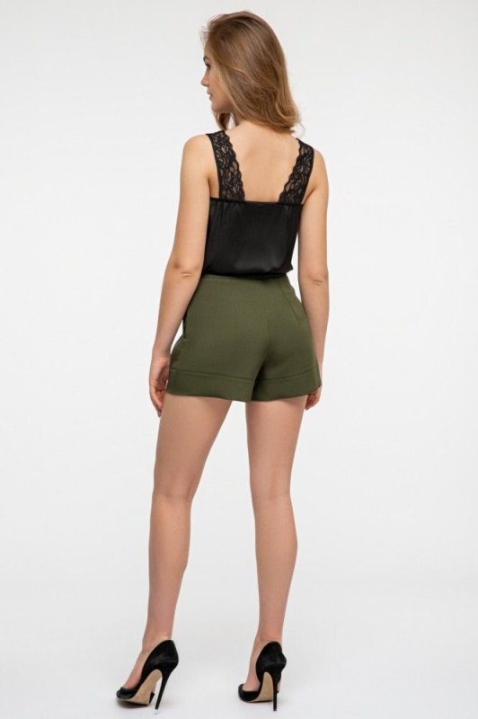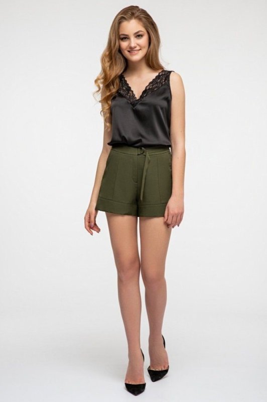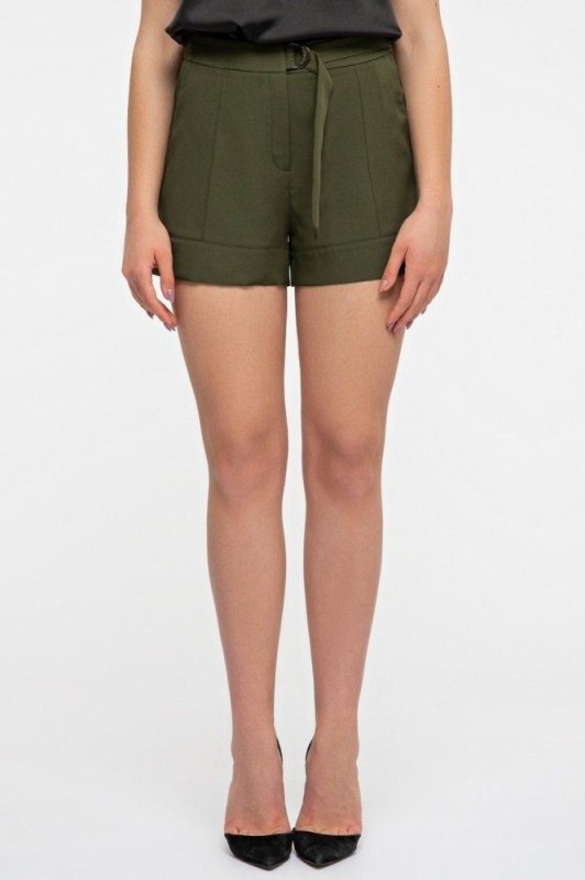 Стильні шорти з костюмної тканини з накладними кишенями. Застібаються спереду на блискавку і затягуються поясом.