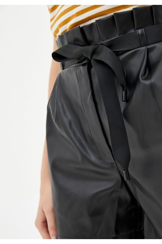 Стильні жіночі шорти паті з високою посадкою і рюшами по лінії талії. Застібаються на гудзик і блискавку, передбачені дві косих прорізних кишені. З боків неглибокі розрізи. Комплектуються знімним тканинним поясом в петлях.