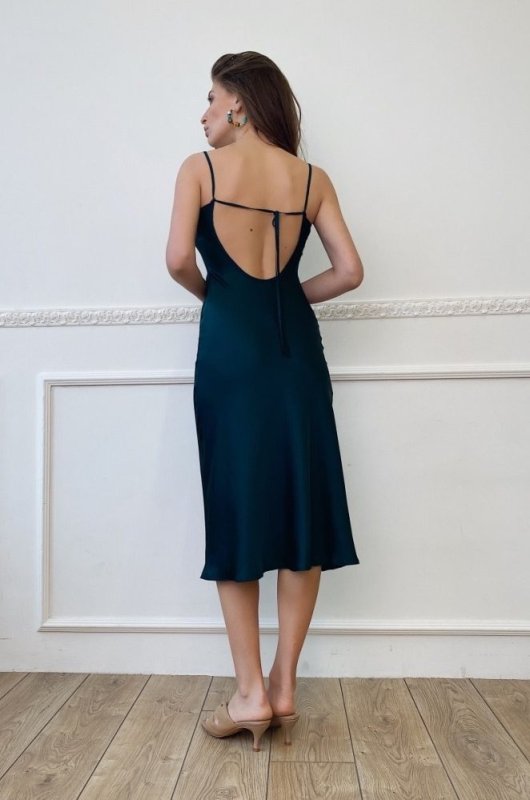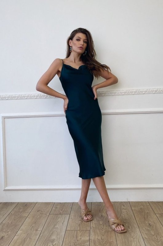 Сукня-міді в модному білизняному стилі на тонких регульованих бретелях, глибоким декольте і відкритою спинкою на зав'язках. Сукня-комбінація поєднує в собі сексуальність, жіночність, зручність і практичність. Вона однаково добре виглядає з кросівками і ошатними човниками, з рокерськими косухами і в'язаними кардіганами. Заміри: довжина по боковому шву-42р. -90 см, 44р. - 90,5 см, 46р. - 91 см.