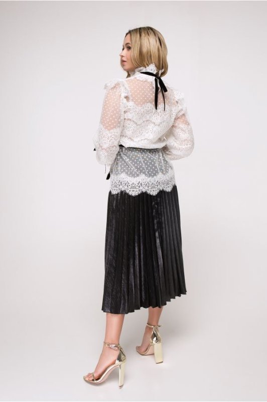 Плісирована спідниця-полусолнце виконана в довжині міді. Модель оформлена еластичним широким поясом, що дозволяє самостійно регулювати висоту посадки.