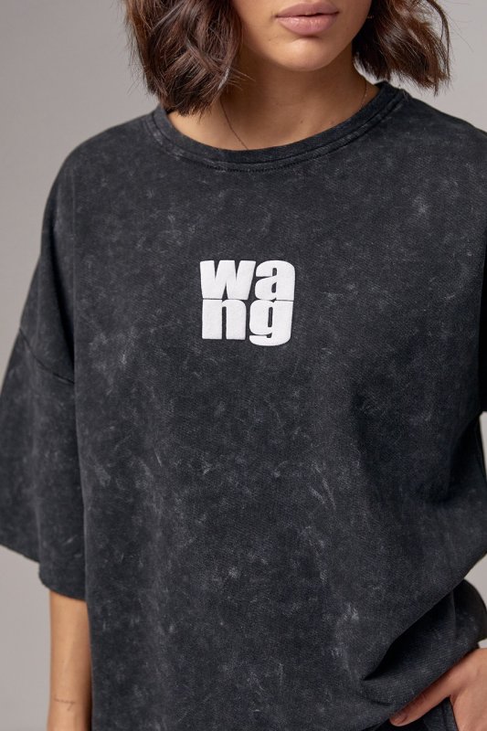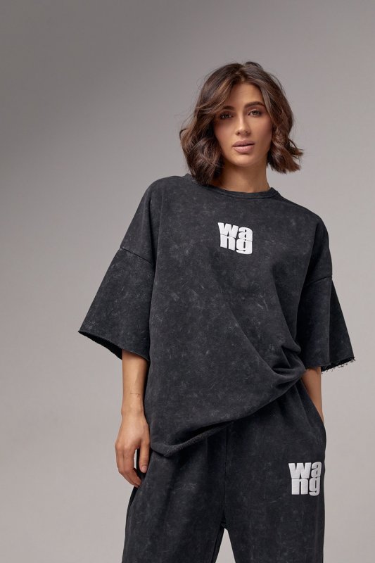 У цьому комплекті світшот у стилі оверсайз прикрашений спереду принтом Wang. У виробі краї низу прямі, без манжетів. Пройми опущені, а четвертні рукави мають необроблений край. Кругла горловина доповнена окантовкою в тон виробу. Штанці до низу звужені, з прямими краями на резинці. У поясі вшита широка резинка, а спереду розташовані прорізні кишеньки.