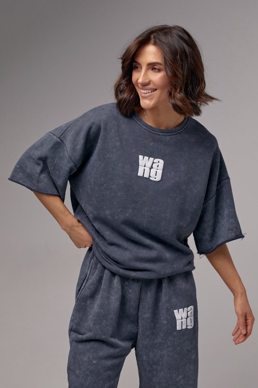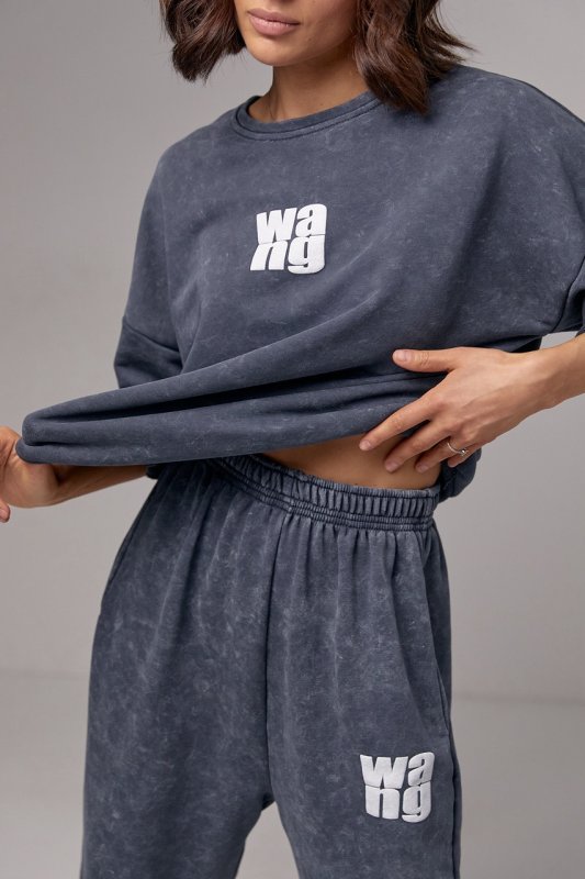 У цьому комплекті світшот у стилі оверсайз прикрашений спереду принтом Wang. У виробі краї низу прямі, без манжетів. Пройми опущені, а четвертні рукави мають необроблений край. Кругла горловина доповнена окантовкою в тон виробу. Штанці до низу звужені, з прямими краями на резинці. У поясі вшита широка резинка, а спереду розташовані прорізні кишеньки.
