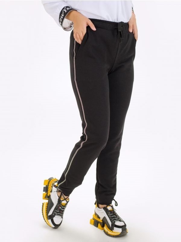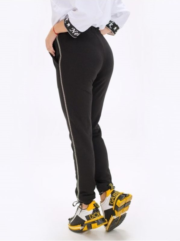 Комфортні, стильні брюки-джоггеры. Широкий, еластичний притачной пояс на зав'язках. З боків лампаси з декоративної тасьми. Бічні, косі кишені. Необроблені краї манжет.