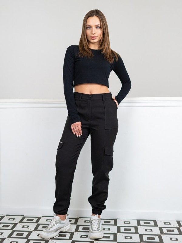 Стильні жіночі штани-карго з еластичними манжетами. Посадка висока, на штанинах врізні кишені з клапанами. В якості декору використаний металевий елемент з найменуванням бренду. Притачной пояс зі шлевками, застібаються на гудзик і блискавку. З боків і ззаду-накладні кишені.