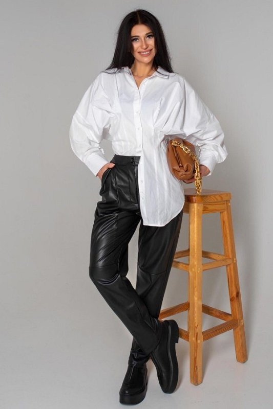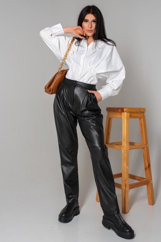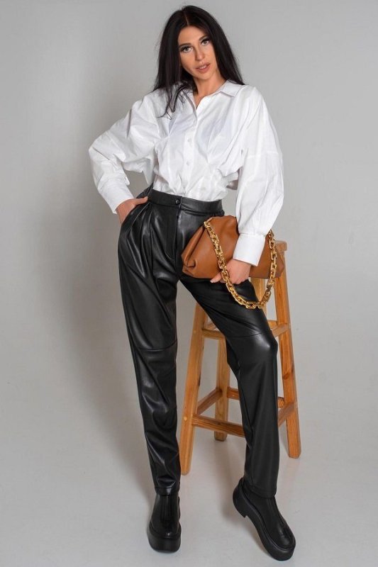 Взимку будуть особливо зручні утеплені штани на хутрі. Наша нова модель шкіряних штанів (екошкіра на хутрі) відрізняється зручністю і практичністю. Штани з середньою посадкою (на талії), з гульфіком і ґудзиком. Практичності додадуть дві бічні кишені. М'які защипи по поясу додадуть Вашому образу жіночності. Така модель брюк візуально звужує талію і підкреслює спокусливу округлість стегон. Така модель брюк буде доречно виглядати і в офісі і на вечірній прогулянці.