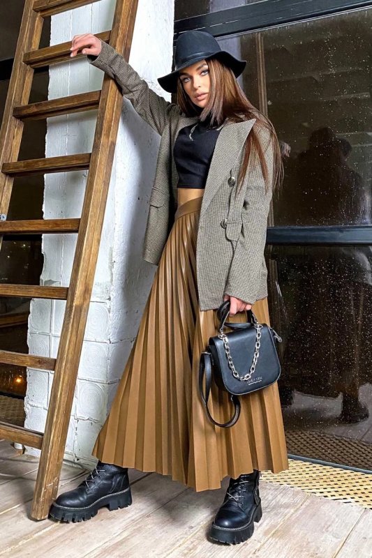ТОП продажів – стильна спідниця плісе з еко-шкіри. Виконана у подвійному розмірі. Є таємна блискавка. Добре стилізується з джемпером, укороченим гольфом, блейзером із масивними плечима.