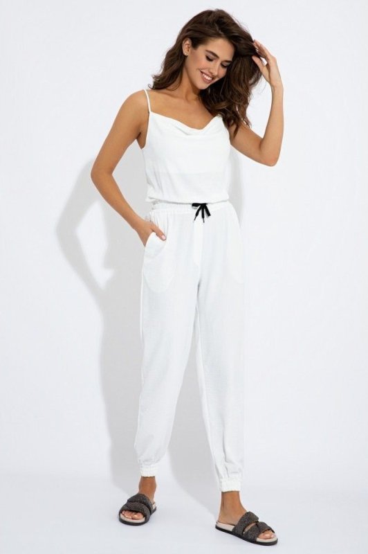 Стильний комбінезон на вузьких регульованих бретелях. На талії присобран на гумку. В бокових швах - кишені.